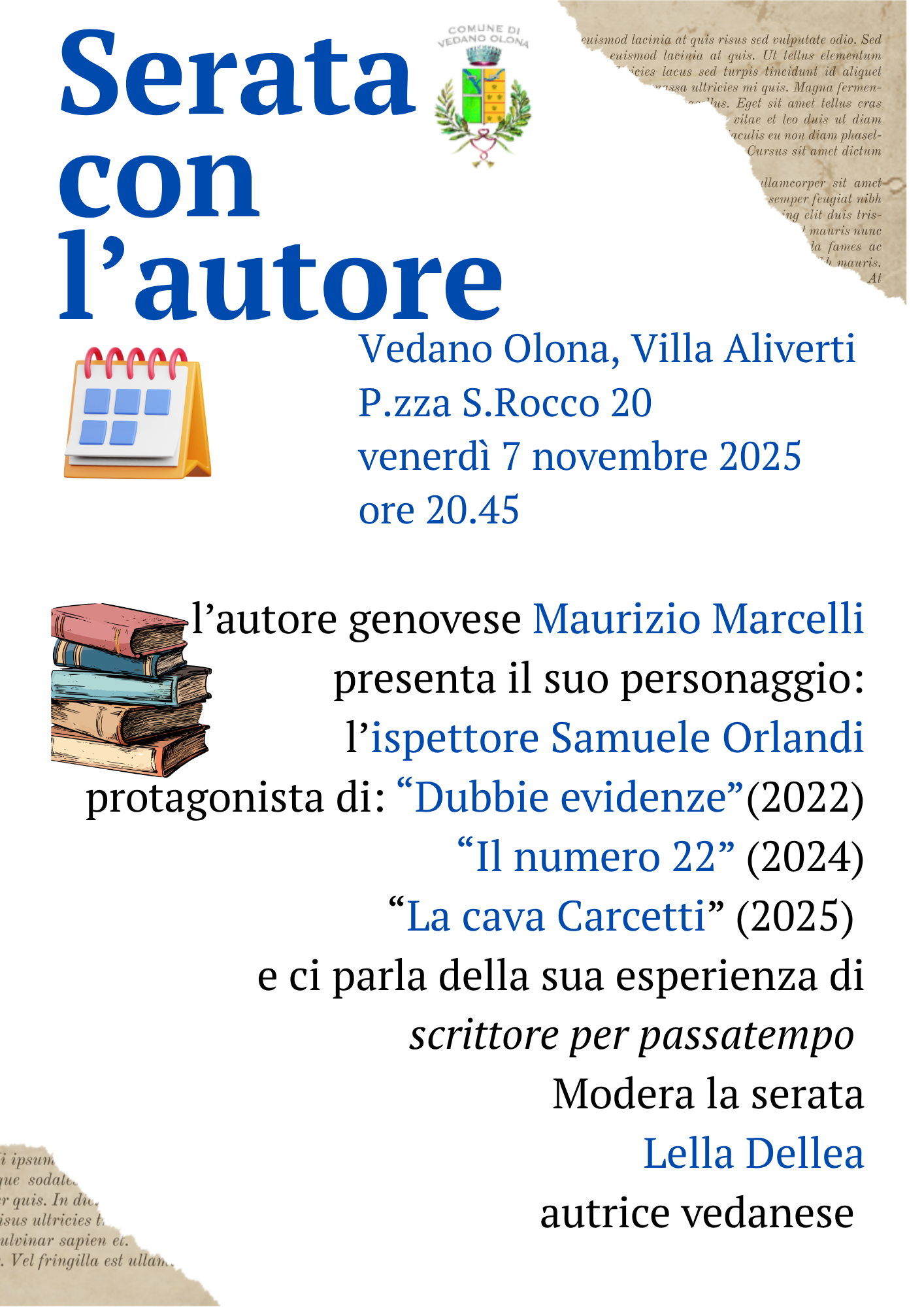 L'Amministrazione Comunale propone per venerdì 7 novembre p.v. alle ore 20:45, presso la sala consiliare della Villa Aliverti, una serata con l'autore genovese Maurizio Marcelli che presenta il suo personaggio: l'Ispettore Samuele Orlandi e parla della sua esperienza di scrittore per passatempo. Modera la serata l'autrice vedanese Lella Dellea.