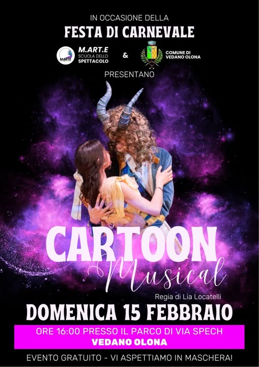 L'Amministrazione Comunale propone, in occasione del Carnevale, per domenica 15 febbraio alle ore 16:00 presso il Parco Spech, "Cartoon Musical" regia di Lia Locatelli.