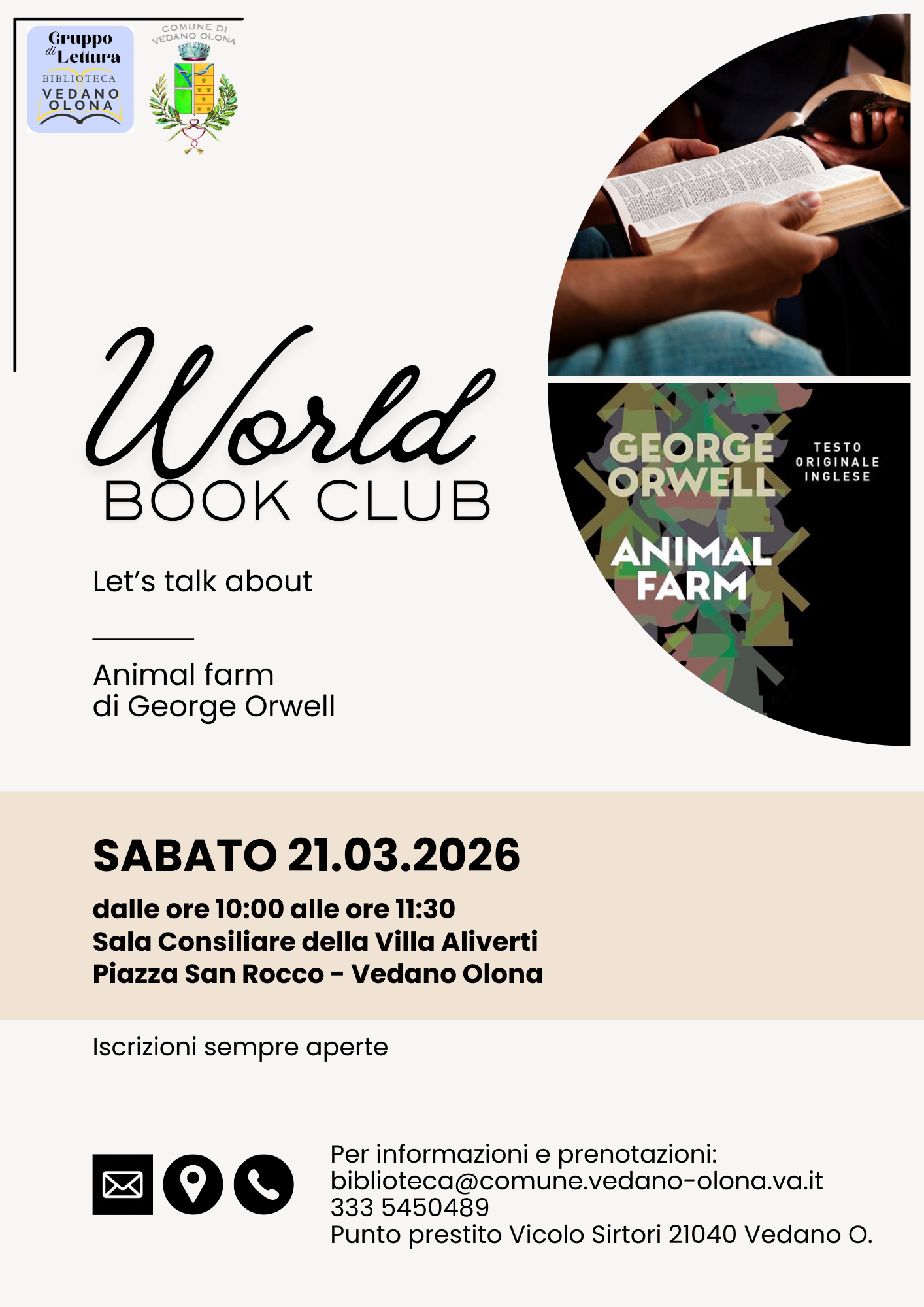 L'Amministrazione Comunale e la Biblioteca Comunale propongono, per sabato 21 marzo 2026 dalle ore 10:00 alle ore 11:30, presso la Sala Consiliare della Villa Aliverti, un incontro del Gruppo di Lettura in lingua inglese "World Book Club".