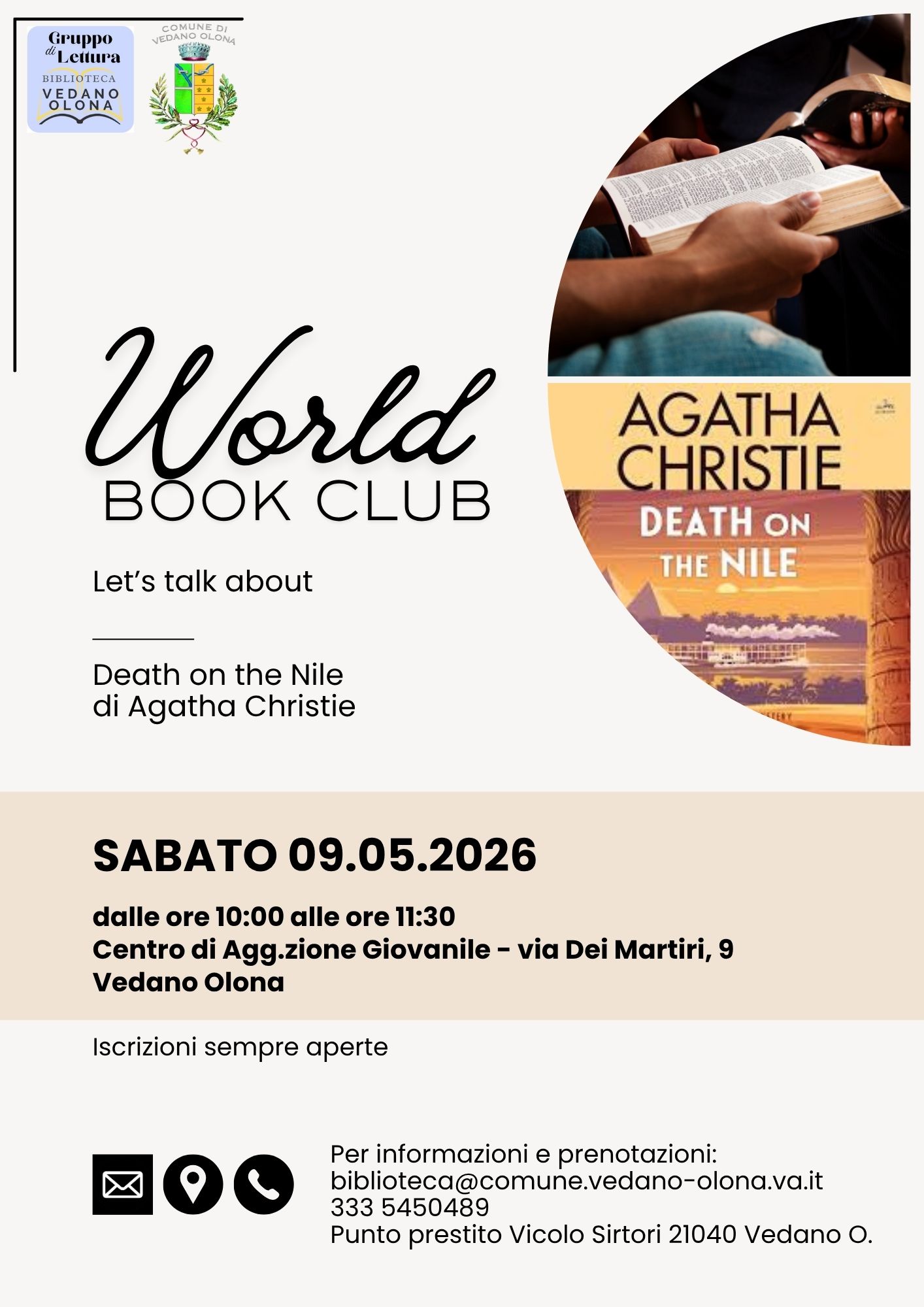 L'Amministrazione Comunale e la Biblioteca Comunale propongono per sabato 9 maggio p.v. alle ore 10:00 presso il Centro di Aggregazione Giovanile, un incontro del "World Book Club" Let's talk about "Death on the Nile".