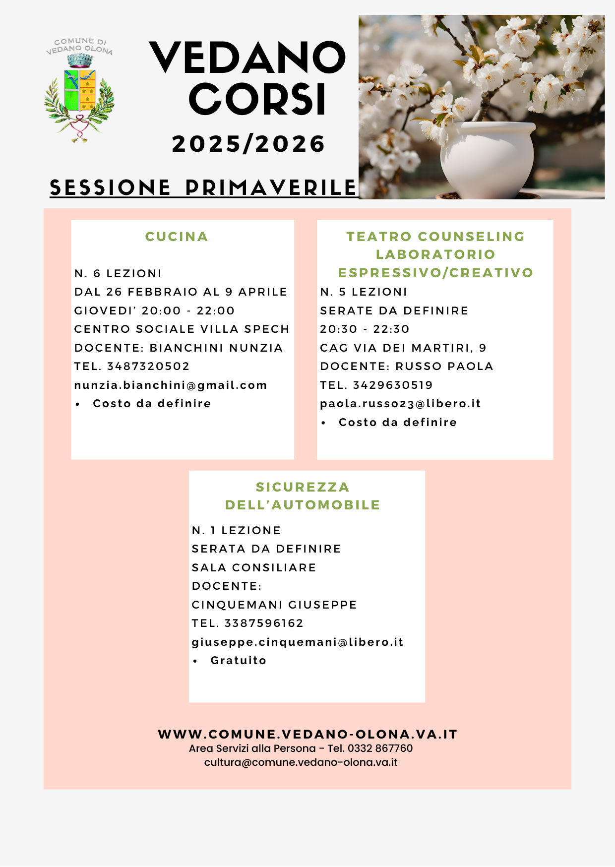L'Amministrazione Comunale, nell'ambito dell'iniziativa Vedano Corsi 2025/2026, propone i seguenti corsi per la sessione primaverile: