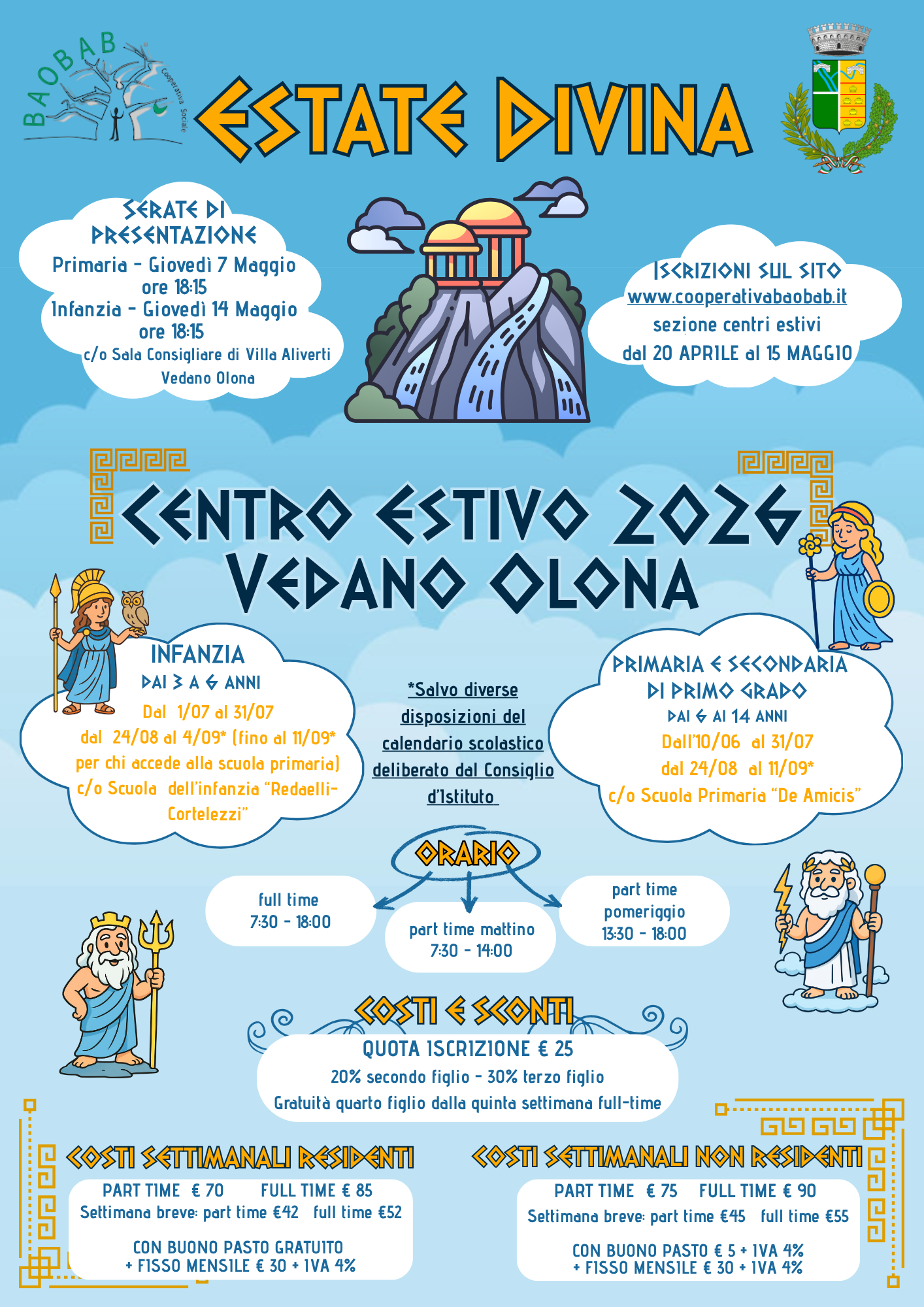 La Cooperativa Baobab a r.l. di Tradate, aggiudicataria dei servizi in concessione relativi ad attività scolastiche integrative e centro estivo, propone per l'estate 2026 presso la scuola dell'infanzia e la scuola primaria di Vedano Olona, il centro estivo dal titolo "Estate Divina", rivolto a bambini/ragazzi dai 3 ai 14 anni.